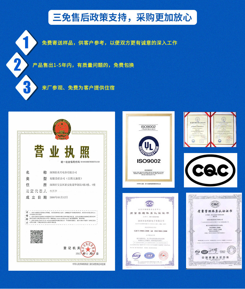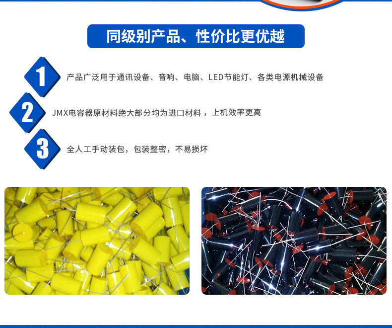 2017年12月28日正式更名為深圳佳名興電容有限公司 佳名興JMX廣東省惠州市電容器工廠占地面積13149平米,廠房面積8227平方米,每年生產(chǎn)的超級(jí)電容(單體、模組、方案定制)薄膜類電容(包括:金屬化薄膜電容、軸向薄膜電容,工業(yè)級(jí)電源用薄膜電容、長(zhǎng)壽命薄膜電容、等)軸向鋁電解電容、電力電容器、雙面金屬化薄膜電容等被動(dòng)元器件達(dá)8-13億只 佳名興JMX電容器60%-70%以上產(chǎn)品出口歐美,印度,東南亞等世界各地,30%-40%銷往中國(guó)大陸,產(chǎn)品規(guī)格齊全,體積小,可靠性優(yōu)良,穩(wěn)定性好,價(jià)格合理 佳名興JMX電容器被廣泛用于:汽車音響,車載分音器,音響分頻器,專業(yè)音響功放,衛(wèi)星通訊設(shè)備,LED驅(qū)動(dòng)電源,LED節(jié)能燈,開(kāi)關(guān)電源及電腦周邊產(chǎn)品等各個(gè)電子行業(yè)