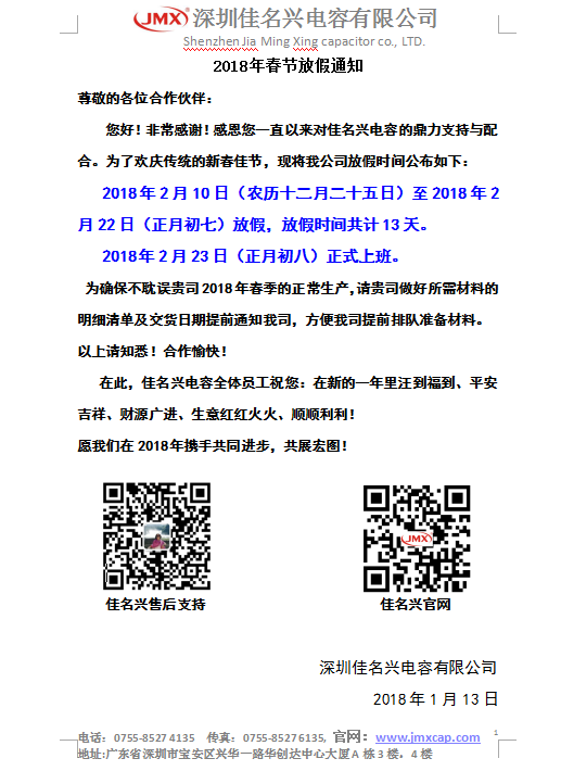 當前位置:佳名興首頁 » JMX資訊 » 2018年佳名興電容春節(jié)放假通知