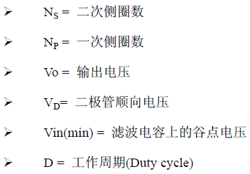 依據(jù)變壓器的圈比關(guān)系,可以初步計(jì)算出變壓器的應(yīng)力(Stress)是否符合選用零件的規(guī)格,計(jì)算時(shí)以輸入電壓264V(電容器上為380V)為基準(zhǔn)。