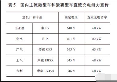 國(guó)內(nèi)主流微型車(chē)和緊湊車(chē)型大部分廠家宣傳30%-80%直流充電時(shí)間30min 左右,充電功率約在60kW-80kW。車(chē)型以低電壓為主。如表5 所示。
