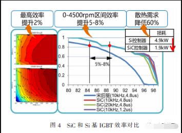 SiC 還具有比IGBT 更低的開(kāi)關(guān)損耗,彌補(bǔ)了部分其工藝復(fù)雜造成的成本高的缺陷。SiC 和Si 基IGBT 的系統(tǒng)效率對(duì)比如圖4 所示(基于某車(chē)型)。