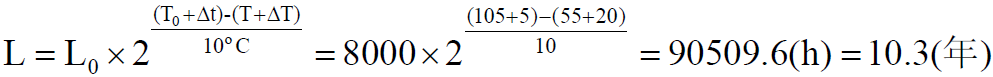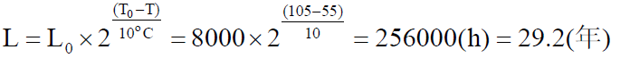 根據(jù)阿列紐斯方程結(jié)論可知,電解電容使用壽命計(jì)算公式如下:
