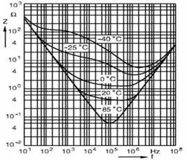 在開關(guān)電源輸出端用的濾波電容,與工頻電路中選用的濾波電容并不一樣,在工頻電路中用作濾波的普通電解電容器,其上的脈動電壓頻率僅有100Hz,充放電時間是毫秒數(shù)量級,為獲得較小的脈動系數(shù),需要的電容量高達數(shù)十萬微法,因而一般低頻用普通鋁電解電容器制造目標是以提高電容量為主,電容器的電容量、損耗角正切值以及漏電流是鑒別其優(yōu)劣的主要參數(shù)。在開關(guān)穩(wěn)壓電源中作為輸出濾波用的電解電容器,由于大多數(shù)的開關(guān)電源工作在方波或矩形波的狀態(tài),含有及其豐富的高次諧波電壓與電流,其上鋸齒波電壓的頻率高達數(shù)十千赫,甚至數(shù)十兆赫,它的要求和低頻應(yīng)用時不同,電容量并不是主要指標,衡量它好壞的則是它的阻抗頻率特性,如圖3所示。