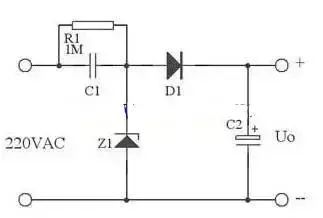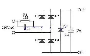 在實(shí)際應(yīng)用中,可以用下圖代替上圖,這里用了Z1正向特性和反向特性,其反向特性(也就是其穩(wěn)壓特性)來穩(wěn)定電壓,其正向特性用來在市電負(fù)半周給C1提供放電回路。