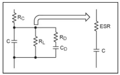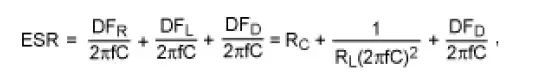 推算電容阻抗模型、計(jì)算ESR (結(jié)果的實(shí)部)時(shí),ESR 是頻率的函數(shù)。這種相關(guān)性可以在下面簡(jiǎn)化的ESR等式中得到證明: