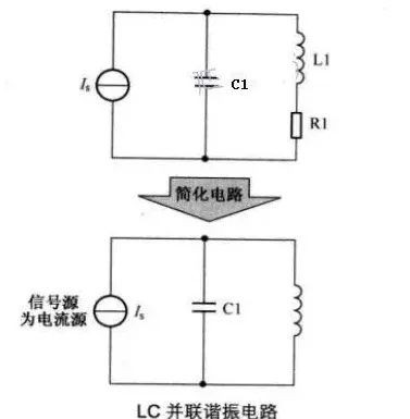 下圖所示是LC并聯(lián)諧振電路,電路中的L1和C1構(gòu)成LC并聯(lián)諧振電路,R1是線圈L1的直流電阻,Is是交流信號源,這是一個(gè)恒流源。所謂恒流源就是輸出電流不隨負(fù)載大小的變化而變化的電源。為便于討論LC并聯(lián)電路,可忽略線圈電阻R1,簡化后的電路如下圖所示。