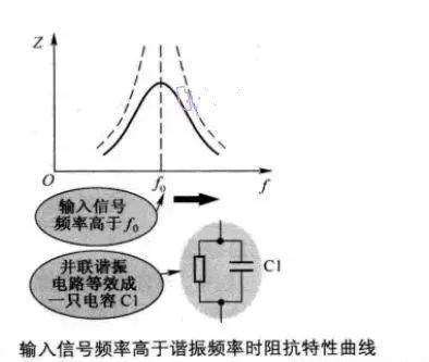 輸入信號頻率高于諧振頻率后,LC并聯(lián)諧振電路等效成一只電容。