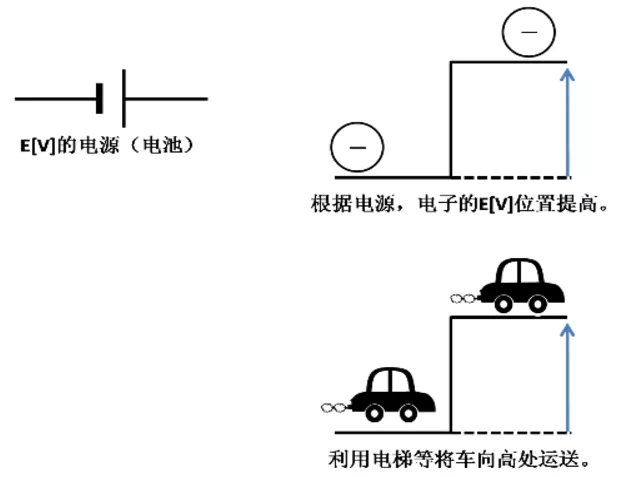 <電源(電池)是負(fù)載著電位差的裝置>電源是在兩端連接負(fù)載著E[V]電位差的裝置。這與汽車?yán)秒娞荩詣拥叵蚋邽閠[m]的位置移動是一個道理。